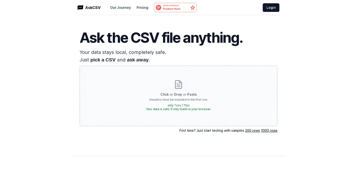 AskCSV lets you unlock the full potential of your CSV data with revolutionary AI technology. Simply pick a CSV and start asking any question to get valuable insights in no time. Your data stays local and safe, so you can use our service with complete peace of mind.
