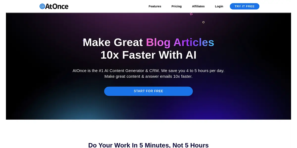 Writing content can be a time-consuming and frustrating experience, but AtOnce makes it easy for anyone to write SEO-optimized articles, social media, email marketing, and anything in between. AtOnce is trained on 1.7 billion SEO articles & marketing from the world's leading experts. It's like having a personal writing assistant that knows how to write anything, 10 times faster.