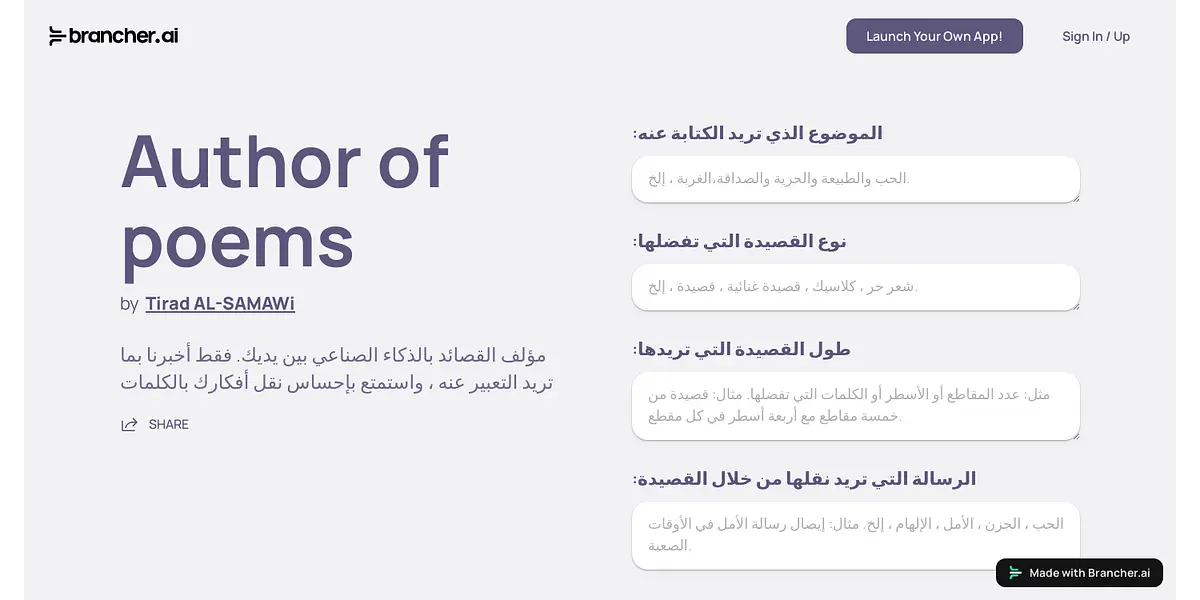 Brancher.ai lets you launch your own app for creating personalized AI-generated poems. Simply tell us what you want to express, and enjoy the sensation of seeing your ideas come to life in words. Sign up for free and start creating today.