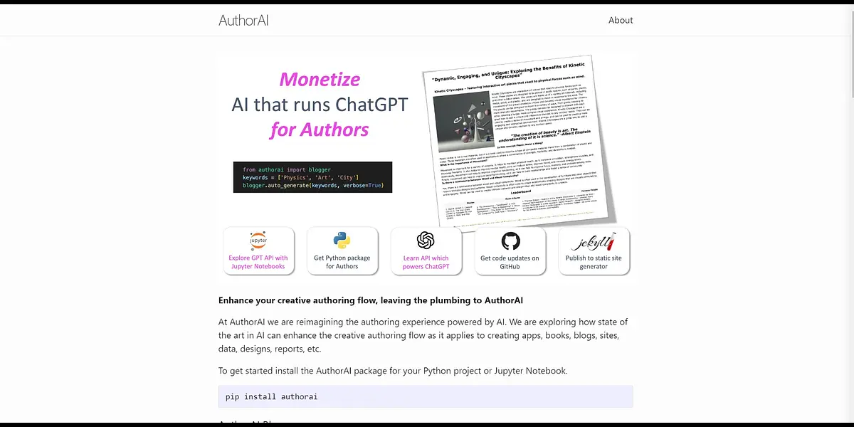 AuthorAI helps bloggers, writers, and authors enhance their creative authoring flow with AI-powered tools for creating apps, books, blogs, sites, data, designs, reports, and more.