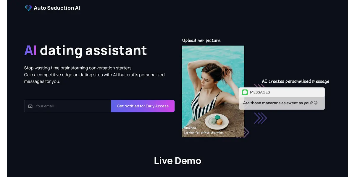 Auto Seduction AI offers an innovative solution for online dating by assisting users with personalized messaging crafted by AI. Say goodbye to wasting time brainstorming conversation starters and hello to gaining a competitive edge on dating sites. Sign up for early access to revolutionize your online dating experience.