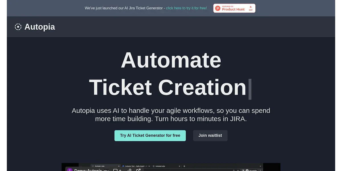 Autopia is a revolutionary product development tool crafted to enhance agile workflow automation. The AI Jira Ticket Generator is an exceptional add-on to this all-in-one platform that helps teams automate their workflow, progress reporting, and roadmap building. Autopia builds AI-powered tools to enhance product development teams' productivity and success rates.