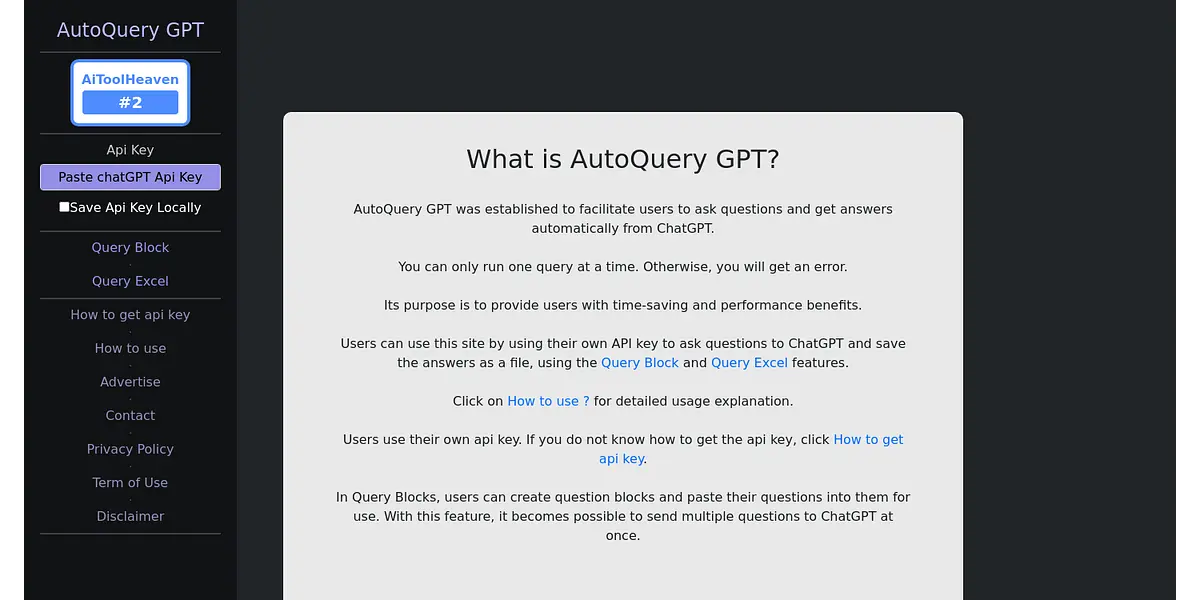 The site's purpose is to enable users to get the most out of their queries and improve their performance. By using their API key, users can easily ask questions to ChatGPT and save the answer file, using features like Query Block and Query Excel. With these features, users can run multiple queries at once, sending questions to ChatGPT and receiving answers promptly.
