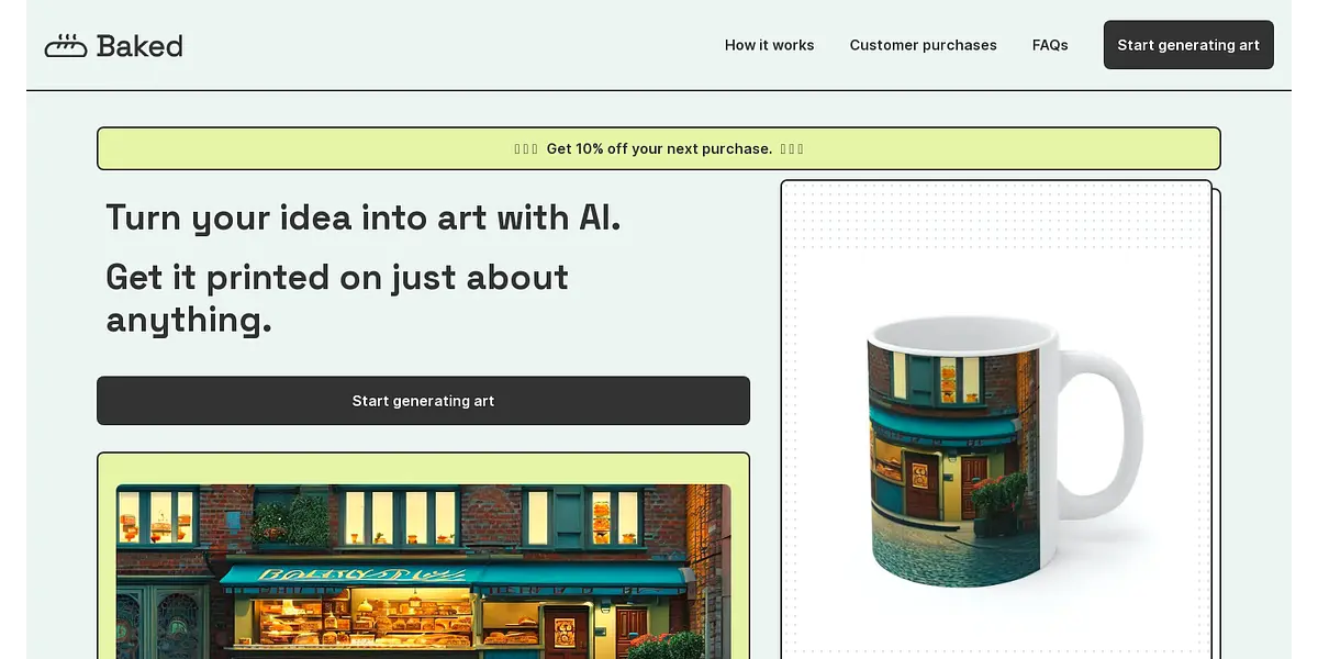 Baked.ai is a platform that allows customers to transform their ideas into art, using advanced AI technology to generate unique designs for a wide range of products. Whether you're looking to create a personalized coffee mug or a custom phone case, Baked.ai can help you turn your vision into a reality.
