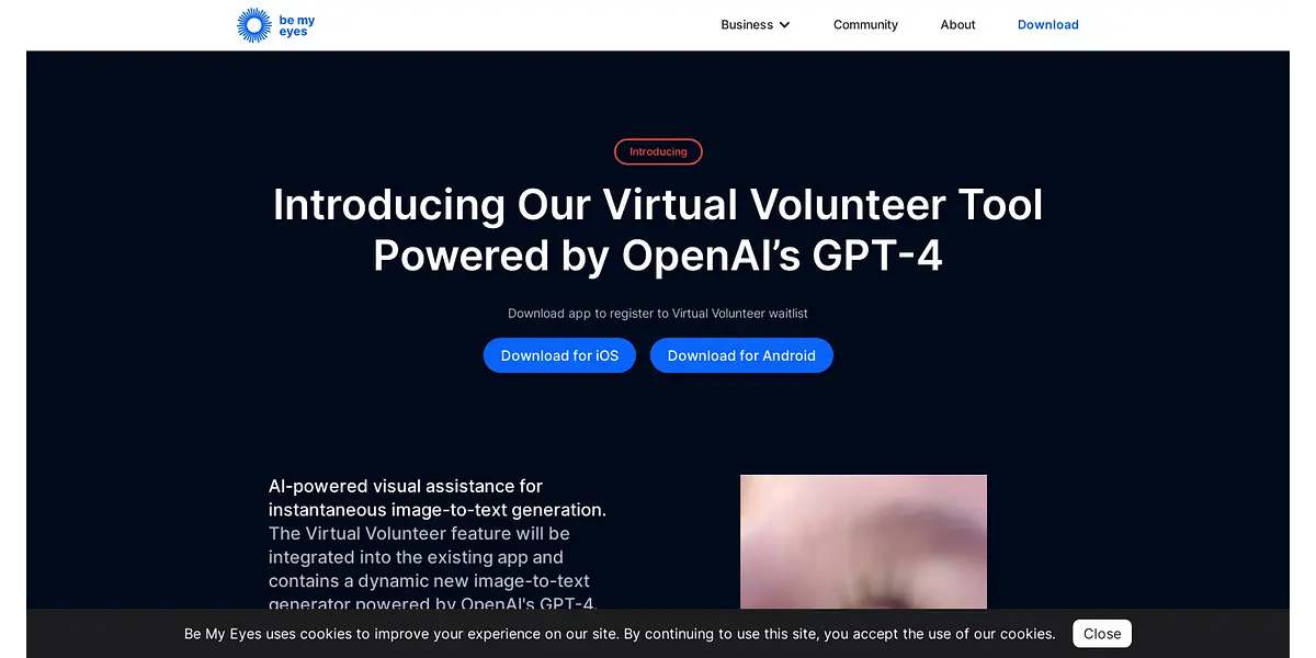 Be My Eyes is a global community-driven organization that connects people with visual impairment with over six million sighted volunteers and professionals worldwide through live video assistance. Its mission is to make the world more accessible to people who are blind or have low vision. Founded by Hans Jørgen Wiberg in 2015, Be My Eyes app is a free service that allows a visually impaired individual to call a sighted volunteer for assistance virtually whenever they need it and get support or advice on various tasks. With its robust features and functionalities, such as Virtual Volunteer powered by OpenAI's GPT-4, Specialized Help, and Be My Eyes for Work, the app promotes more independence for blind or low-vision users for tasks big and small.