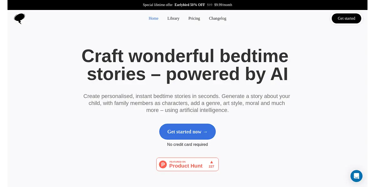Create personalized bedtime stories for your child with ease using AI technology. Customizable characters, settings, and morals let you tailor the story to your child's interests and needs. Join now for a lifetime offer of 50% off earlybird pricing.