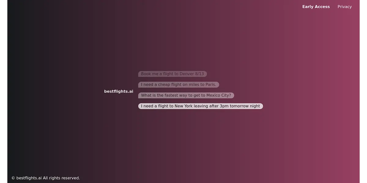Bestflights.ai is a leading online flight booking platform that offers a hassle-free and straightforward solution to book flights quickly and easily. Our user-friendly platform enables travelers to search, compare and book flights with ease, making us the preferred choice for all your flight booking needs. Whether you are looking to book domestic or international flights, round-trip or one-way, our platform caters to it all. From budget airlines to luxury carriers, we provide you with a wide range of options to choose from. Our platform ensures that you get the best deals and discounts on your flight bookings, thus saving you time, money and effort. We understand that privacy is a priority for our customers and therefore ensure that all your personal details and payment information are kept confidential and secure. At Bestflights.ai, we believe in offering our customers a seamless and pleasurable flight booking experience, ensuring maximum satisfaction. Our team of experts is available 24/7 to assist customers with any queries or concerns they may have. Book with Bestflights.ai today and experience quick, easy and hassle-free flight bookings!