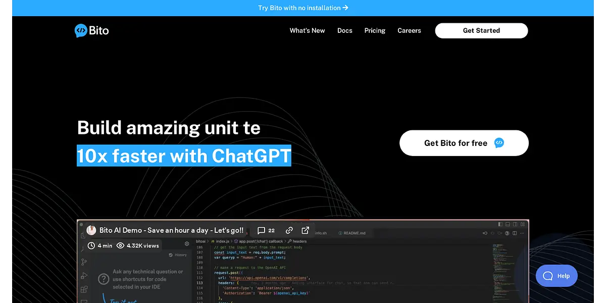 Bito offers AI-powered assistance to help developers build amazing units 10x faster without any installation needed. With OpenAI and ChatGPT integration, Bito offers top-notch security and data privacy, protecting your code and logs from being traced by any individual user. Get Bito today for free and 10x yourself with ChatGPT.
