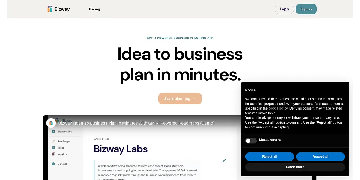 Lastly, it's important to note that Bizway is committed to protecting your privacy and only uses cookies or similar technologies for technical purposes and, with your consent, for measurement as specified in the cookie policy. Denying consent may make related features unavailable, but you can freely give, deny, or withdraw your consent at any time. So why wait? Transform your ideas into actionable plans with Bizway's GPT-4 powered business planning app and start your new venture today!