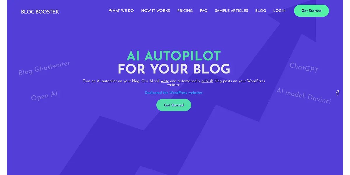 BlogBoosters is the ultimate solution for bloggers, as it turns on the AI Autopilot for your WordPress website. With our advanced AI model, Davinci, your blog posts will be created and automatically published without any intervention. Our services are exclusively dedicated to bloggers who want to save time and boost their blog's productivity. Get started with BlogBoosters today!