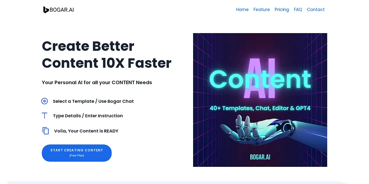 Bogar AI is a revolutionary content creation platform that helps writers, bloggers, marketers, and businesses of all sizes to create better content 10X faster than traditional methods. Whether you're struggling with writer's block or need help generating eye-catching headlines, Bogar AI has got you covered.