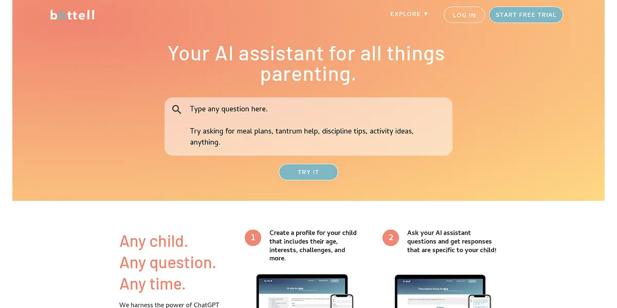 Bottell is an AI-powered assistant that provides personalized and effective parenting advice. By creating a profile for your child and asking your questions, Bottell offers tailored responses that are specific to your child's age, interests, challenges, and more. From meal plans and scheduling to educational guidance and support, Bottell helps you nurture your child's development with ease.