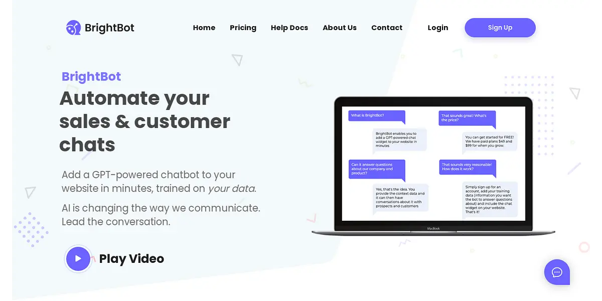 BrightBot is an AI-powered chatbot platform that automates sales and customer chats. With BrightBot, businesses of all sizes can easily add a GPT-powered chatbot to their websites in minutes, and train the chatbot on their data to provide natural conversations about the topics they provide. The chatbot uses the latest GPT machine learning models to provide fast response times, even when the team is busy.