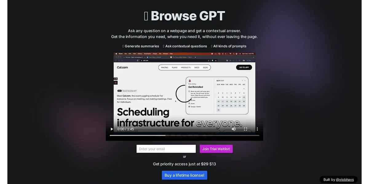 GPT is a revolutionary tool that allows you to ask any contextual question on a webpage and get accurate answers instantly. With GPT, you don't have to leave the page to get the information you need. You can generate summaries, ask all kinds of prompts, and get the answers you need without any hassle. Signup for priority access at just $29 $13 or join the waitlist for a free trial today!