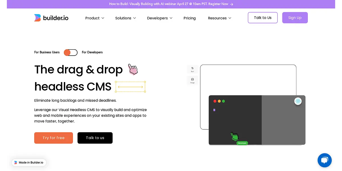 Builder.io offers a revolutionary drag-and-drop headless CMS that enables digital teams to build high-performing web and mobile experiences without long backlogs and missed deadlines. With code and no-code options, you can visually build and optimize existing sites and apps with ease.