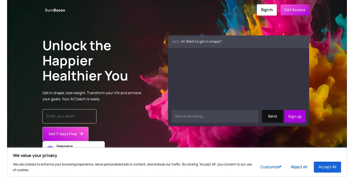 BurnBacon is your go-to destination for achieving your health and wellness goals. Our AI Coach, personalized guidance, and expert support will motivate and guide you on your transformative journey toward a happier, healthier you. Sign up now and unlock incredible benefits!