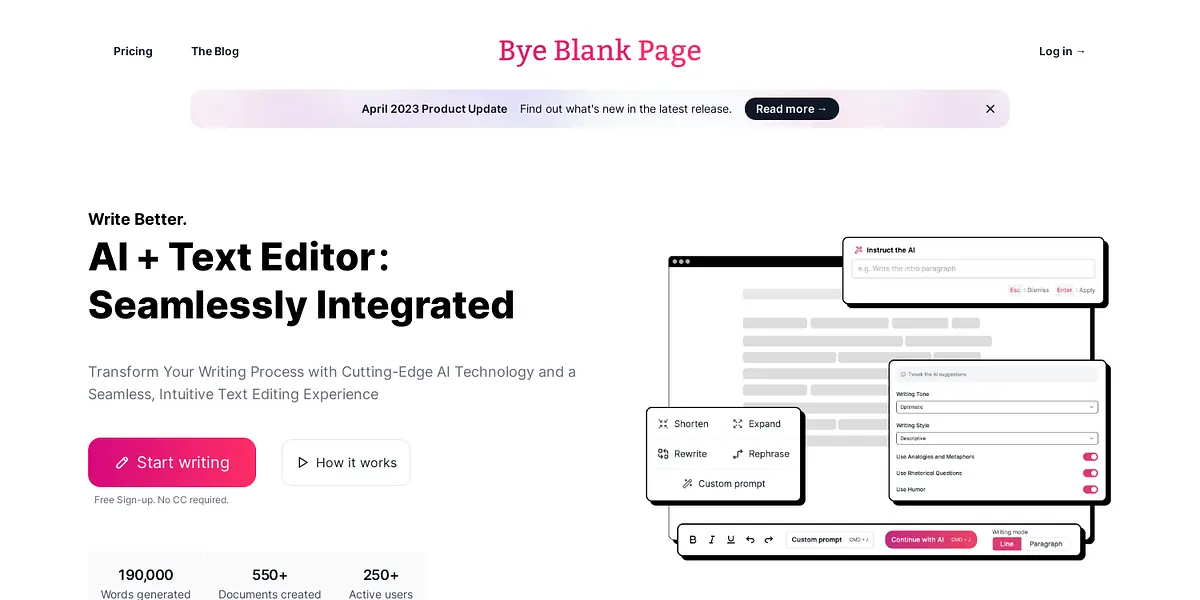 Are you tired of staring at a blank page, struggling to find the right words? Do you wish for a tool that could help you write smarter and faster? Look no further than Bye Blank Page, the AI-powered text editor that revolutionizes the writing process.