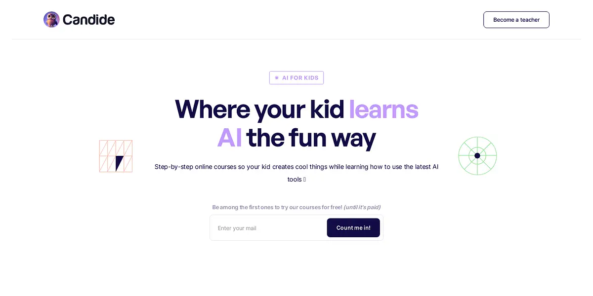 Unleash your child's creativity with AI-powered courses from Candideai.com. Your child can learn how to use the latest AI tools, create fantastic things, and become an expert in AI, all while having great fun. Try our courses for free today!