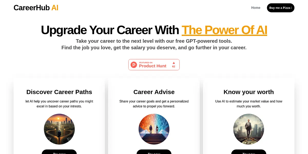Take charge of your career with CareerHub AI's powerful GPT-powered tools. Discover new career paths based on your interests, get personalized career advice, estimate your market value and craft a killer resume, all using the power of Artificial Intelligence. Try now for free and take your career to new heights.