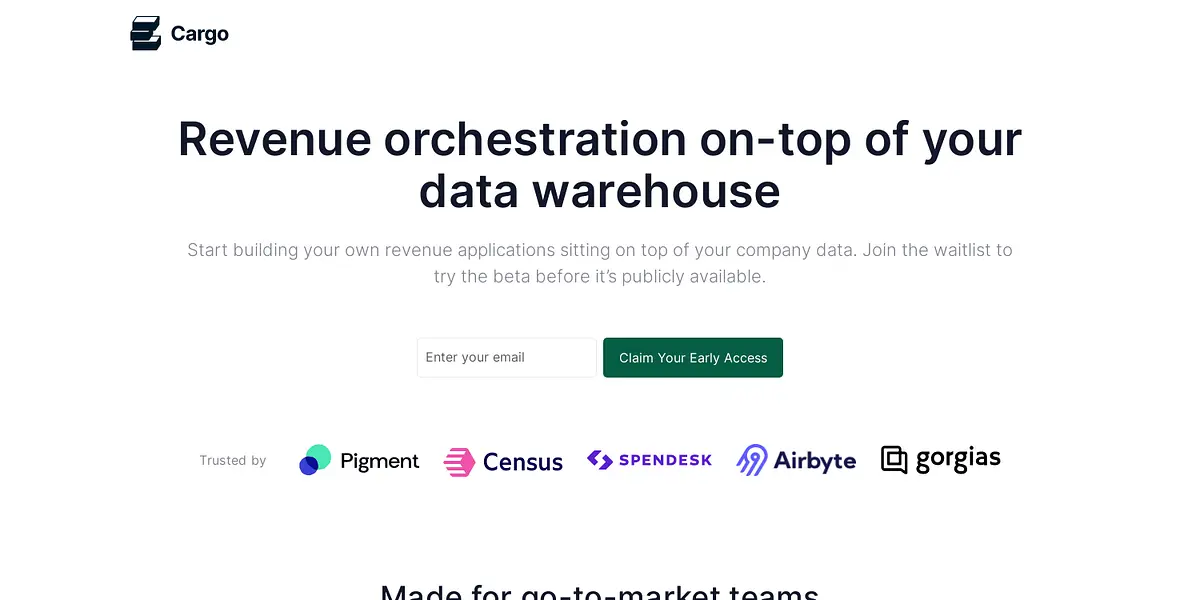 Are you tired of the technical overhead involved in making data work for you? Cargo offers a solution to this problem with revenue orchestration on top of your company's data warehouse. As a trusted platform made for go-to-market teams, Cargo's agnostic pre-built templates can be tailored to meet specific use-cases, making it easy to identify cross-selling and upselling opportunities. Optimizing sales efforts through custom lead and account scoring helps teams maximize their efforts while motivating users to purchase more. But don't just take our word for it! Customers such as Alfie Marsh, Head of Sales at Spendesk, and Pedro Costa, Head of Growth at Coverflex, have found success using Cargo to build apps tailored to their specific needs. Plus, Cargo brings business folks on top of the data stack, contributing to data democratization. Learn more about the foundation of your revenue architecture, the right approach to B2B lead scoring, and what Prospect Relationship Management (PRM) is all about with Cargo's informative articles. Unlock your data's revenue potential with Cargo today.