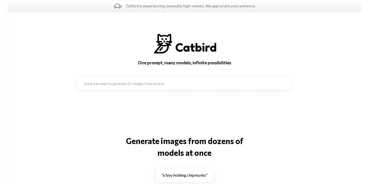 Unlock the power of multi-model image generation with Catbird – the go-to tool for creators and innovators. Catbird offers a unique and unparalleled experience that allows you to generate a variety of images from a single prompt, utilizing over 15+ models to bring your ideas to vivid life. Whether you seek dreamlike diffusion or stable diffusion, Catbird offers an array of models that cater to all your creative needs!