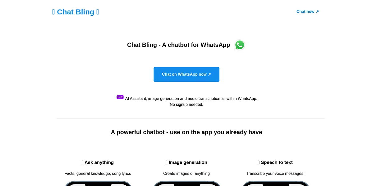In conclusion, Chat Bling is an exciting new chatbot that offers a wide range of useful features, all within the familiar WhatsApp app. With no sign-up needed, users can start chatting right away and get started on using the platform's many benefits. From speech-to-text transcription to image generation, Chat Bling is a powerful and versatile tool that is perfect for anyone looking to take their WhatsApp conversations to the next level.