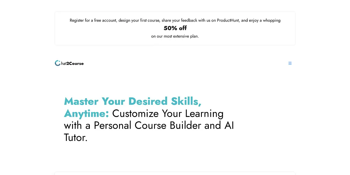 "Get a personalized learning experience like never before with Chat2Course. Design and customize your own courses with an AI tutor that adapts to your learning style. Try it for free and get 50% off on our most extensive plan."