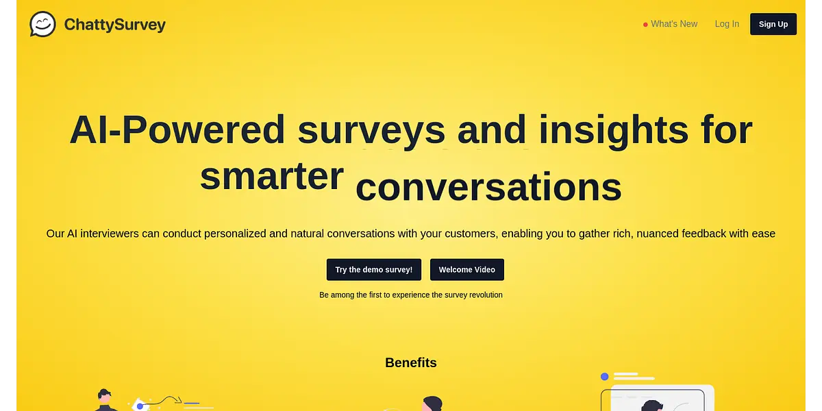 ChattySurvey is a new and revolutionary platform that offers AI-driven surveys and insights for smarter decisions. With ChattySurvey, you can transform your surveys into interactive, chat-based experiences that capture your audience's attention and yield higher response rates.