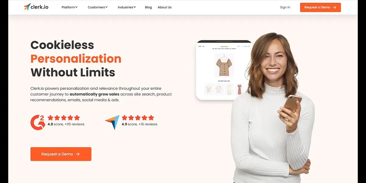 Clerk.io is an AI-powered personalization platform that helps online businesses boost their sales and engagement. Our platform uses machine learning algorithms to deliver personalized experiences for each individual customer, resulting in higher conversion rates and increased revenue.