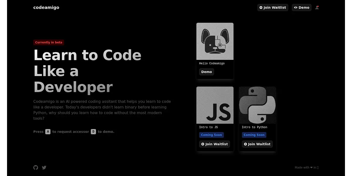 Codeamigo is on a mission to make learning to code easy and fun for everyone. Gone are the days when aspiring developers had to start with complex binary systems before moving on to languages like Python or JavaScript. Now, with an AI-powered coding assistant like Codeamigo, anyone can learn how to code without the pain and frustration that often comes with traditional learning methods. Codeamigo provides a simple yet effective platform that helps users learn coding at their own pace and on their own schedule. With a wide range of courses and tutorials, Codeamigo makes it easy for newcomers to get started with the basics while still catering to more experienced users who want to build more advanced projects. By leveraging the power of AI, Codeamigo can provide a truly personalized learning experience that adapts to the needs and preferences of each individual user. Whether you're just starting out or you've been coding for years, Codeamigo is the ultimate tool to help you take your skills to the next level. Join the waitlist today and experience the future of coding education!