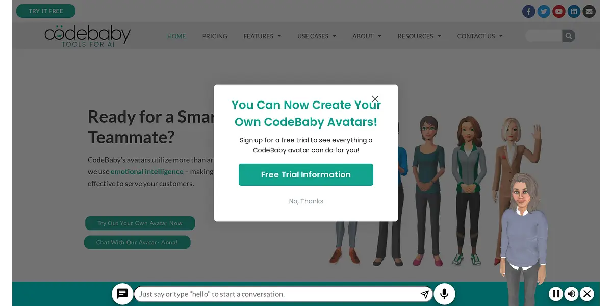 CodeBaby's avatars go beyond AI and utilize emotional intelligence to provide exceptional customer service. With features such as speech, empathy, visual engagement, and personalization, CodeBaby avatars redefine the chatbot experience. Add a CodeBaby avatar to your site and improve accessibility, engagement, and outcomes for every user. Try it out for free.