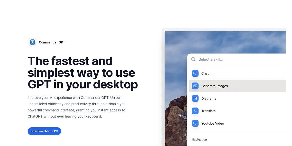 Commander GPT is a groundbreaking command interface for AI that helps you use GPT effortlessly on your desktop. It is designed to be the fastest and simplest way to access GPT and unlock unparalleled efficiency and productivity. If you're looking for a powerful and easy-to-use AI tool that works seamlessly with your desktop, then Commander GPT is the perfect solution.
