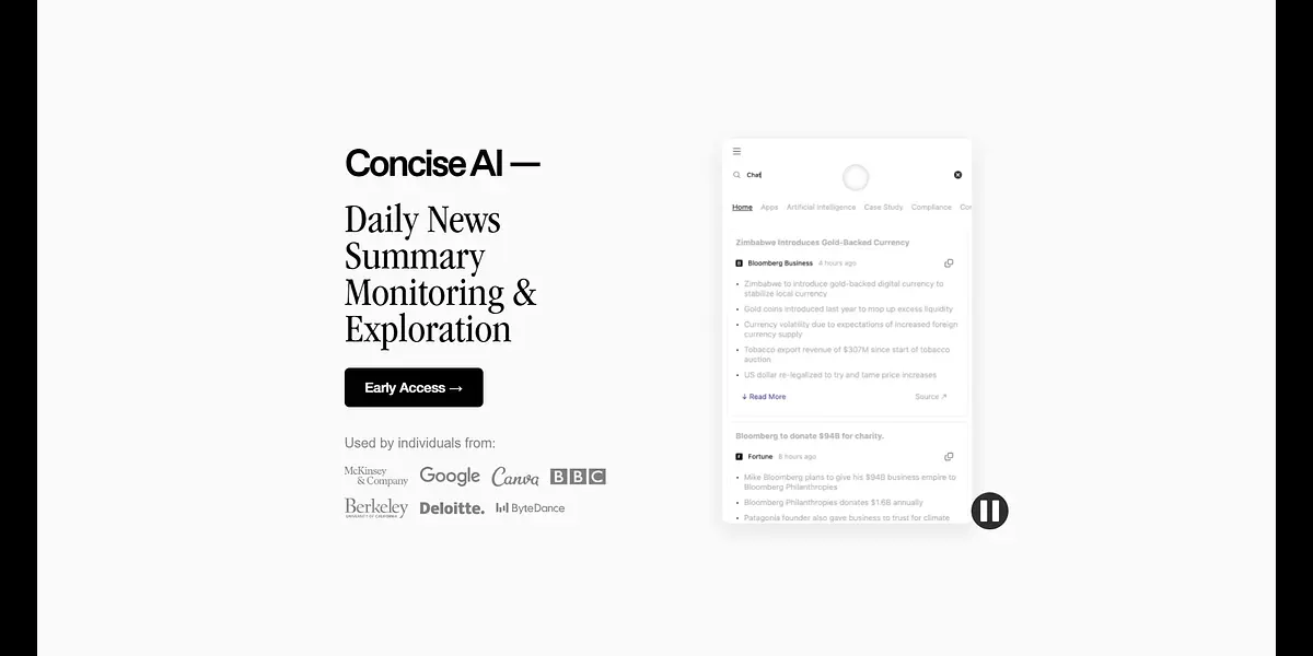 Concise AI provides a daily news summary monitoring and exploration platform that helps individuals stay informed about the latest developments. It offers early access to important news stories so users can stay ahead of the curve.