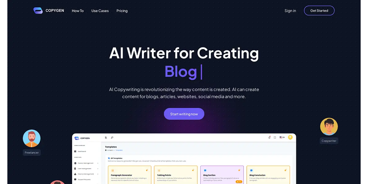 Boost your writing productivity with AI Writer, eliminate writer's block, and have access to a team of copywriting experts. Sign up now, use our tools, and request API access anytime. We at CopyGenAI are dedicated to providing top-quality content writing services that are efficient and user-friendly, and we stand behind our products 100 percent.