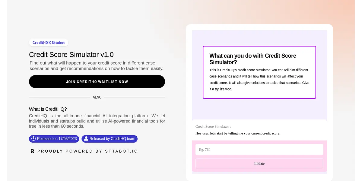 "Get ahead of the game with CreditHQ's credit score simulator v1.0! Discover how your credit score will change in different case scenarios and receive tailored recommendations on how to tackle them with ease. Join our waitlist now and unlock the potential of AI-powered financial tools for free in just 60 seconds!"