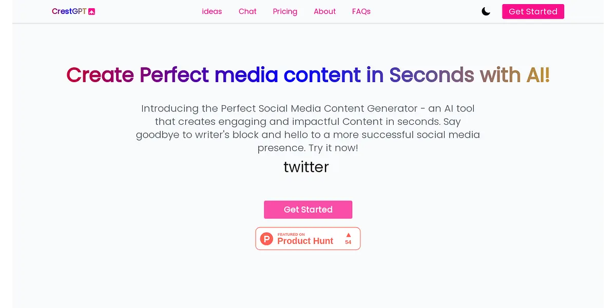 Say goodbye to writer's block and hello to a more successful social media presence with CrestGPT - the perfect social media content generator that creates engaging and impactful content in seconds using AI.