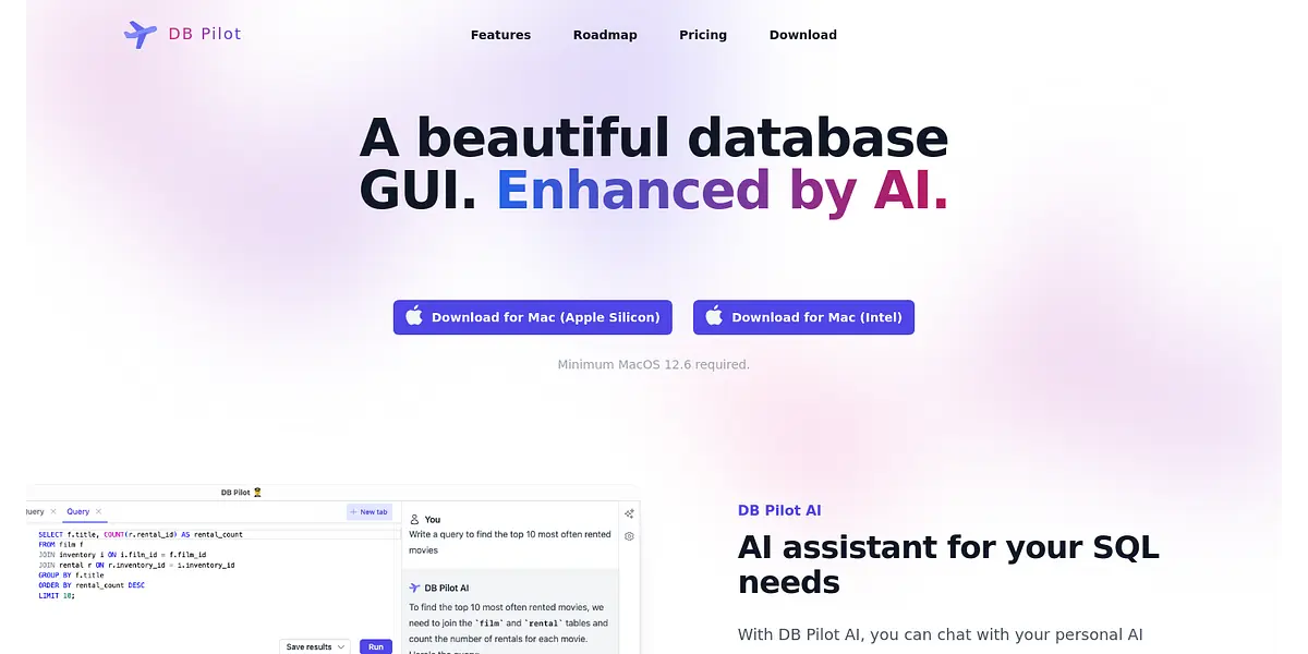 DB Pilot is the future of database GUIs, combining innovative technology with an easy-to-use interface. With its advanced AI assistant, DB Pilot enables users to write complex SQL queries by simply describing them in English. Powered by GPT-3.5, DB Pilot AI understands the intent behind your instructions and delivers the perfect SQL query. Instead of manually converting code to SQL or doing complex joins between different data formats, simply chat with DB Pilot AI.