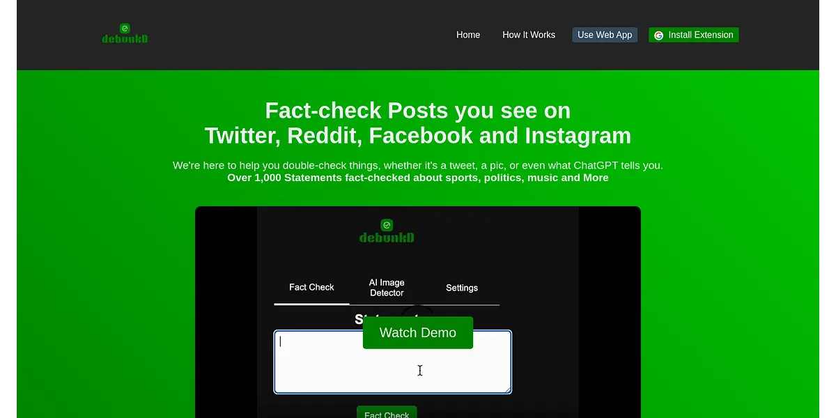 In a world where misinformation spreads like wildfire, Debunkd stands at the forefront, providing a powerful tool to combat false narratives and promote a trustworthy digital environment. With our web app and browser extension, users can now verify the authenticity of posts on popular social media platforms such as Twitter, Reddit, Facebook, and Instagram.