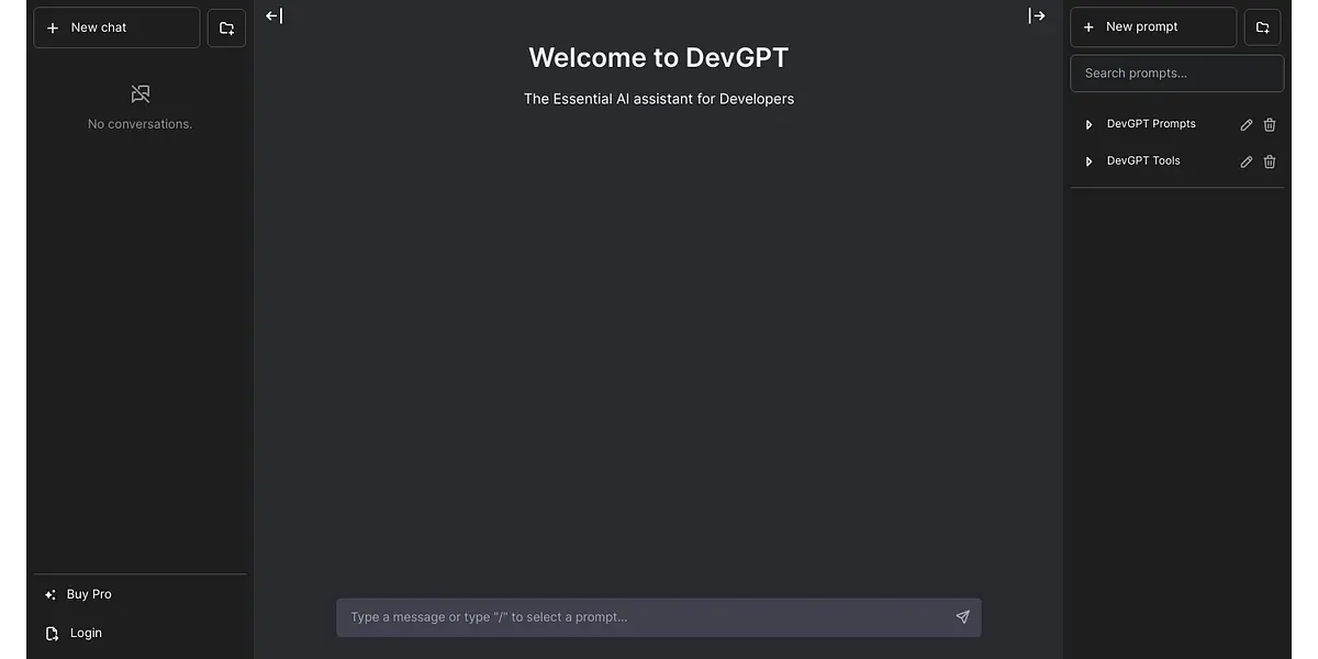 Are you tired of spending countless hours scouring the web for solutions to your coding problems? Look no further than DevGPT, the premium AI assistant for developers. With DevGPT, you'll gain access to a host of cutting-edge tools and resources designed to streamline and enhance your coding process, including new prompts and tools regularly added to the platform. Say goodbye to the frustration of complicated coding, and say hello to enhanced productivity and coding confidence with DevGPT. Whether you're a seasoned developer or just starting out, DevGPT is the essential tool for programming success. So why wait? Sign up for DevGPT today and experience the ultimate coding solution for yourself!