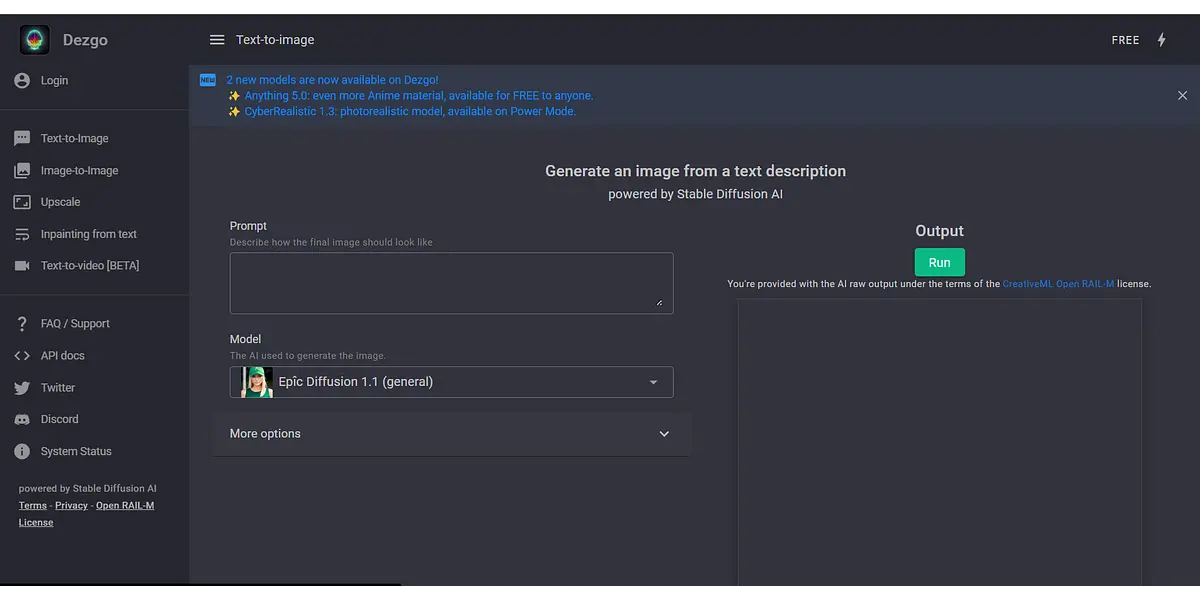 Dezgo is an innovative AI-driven image generation tool that allows users to create stunning visuals from text descriptions using advanced models, algorithms and sampling techniques. The platform is designed to help artists, graphic designers, animators and content creators streamline their workflow and achieve their creative vision effortlessly. With impressive features such as the CyberRealistic 1.3 photorealistic model, portrait, square, and landscape resolutions, and unique image seed numbers, users have the freedom to customize their image generation process. Additionally, the platform offers Upscaling features and provides access to raw AI outputs under the CreativeML Open RAIL-M license. Overall, Dezgo is a powerful tool that caters to everyone, from amateurs to professionals, looking to create stunning visuals with ease.