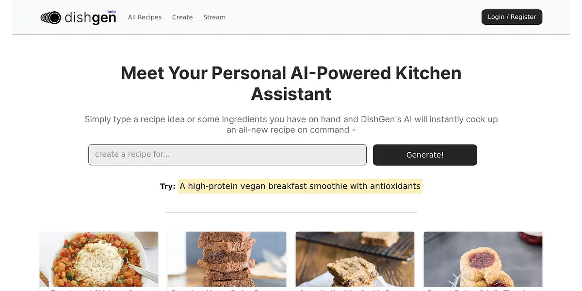 DishGen is a revolutionary AI-powered recipe generator that is transforming the way we plan and prepare meals. With DishGen, you no longer have to spend hours browsing cookbooks or searching recipe blogs for ideas. Simply type in a recipe idea or some ingredients you have on hand, and our advanced algorithm will instantly craft a completely unique recipe just for you.