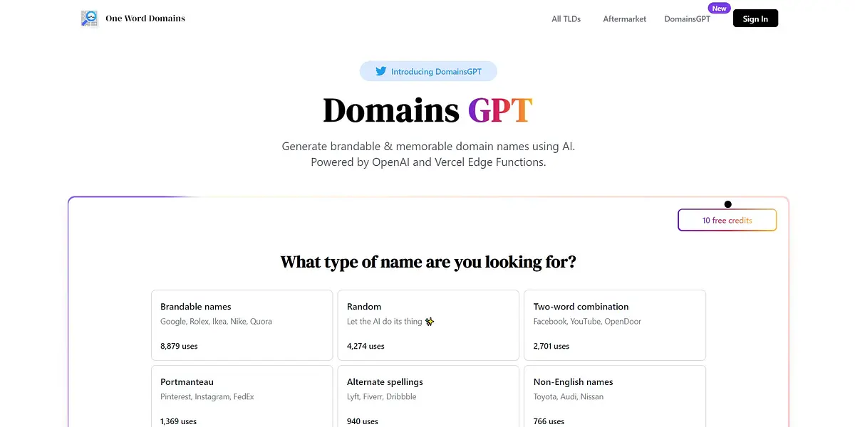 Find the perfect brandable one-word domain for your startup with One Word Domains. Our database of 1,294,245 available domains across 90 TLDs is curated to make your search easy and efficient. Plus, with lifetime access and a one-time price, you won't find a better deal anywhere else.