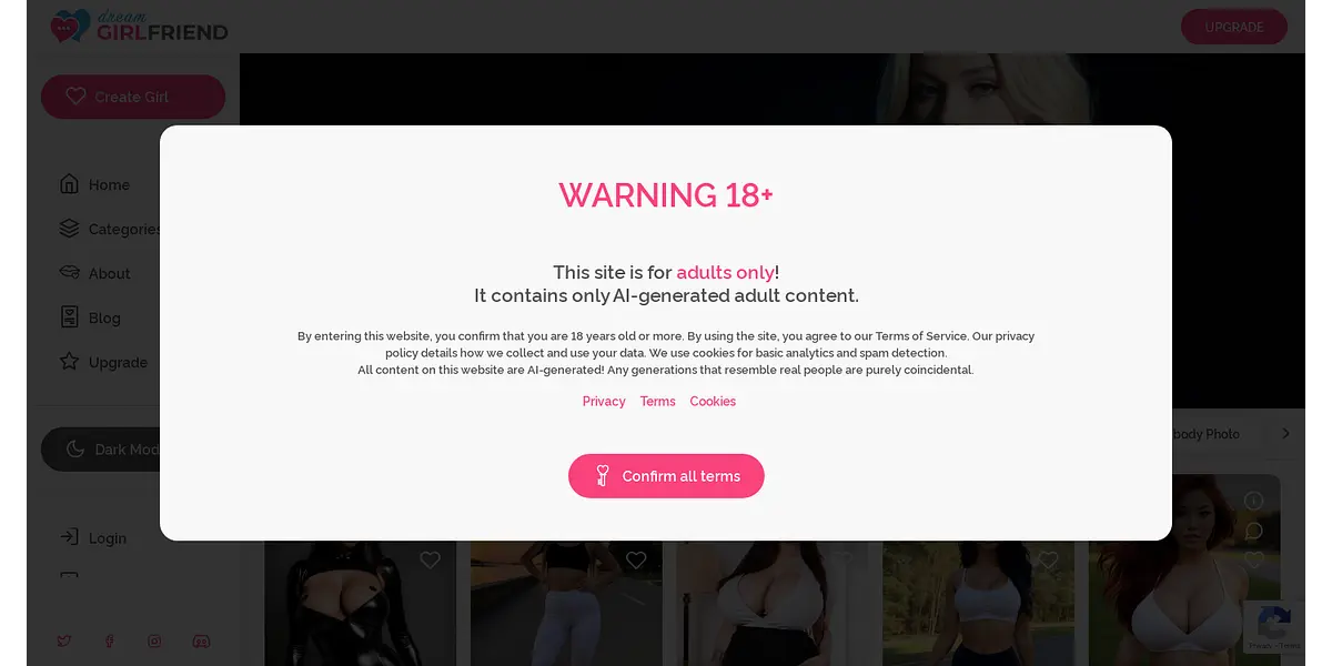However, it is important to note that DreamGF AI is an adults-only site and contains explicit adult content. By entering the site, you confirm that you are 18 years of age or older and agree to the site's terms of service and privacy policy. The site uses cookies for basic analytics and spam detection, and all content is AI-generated to ensure the privacy and safety of users.
