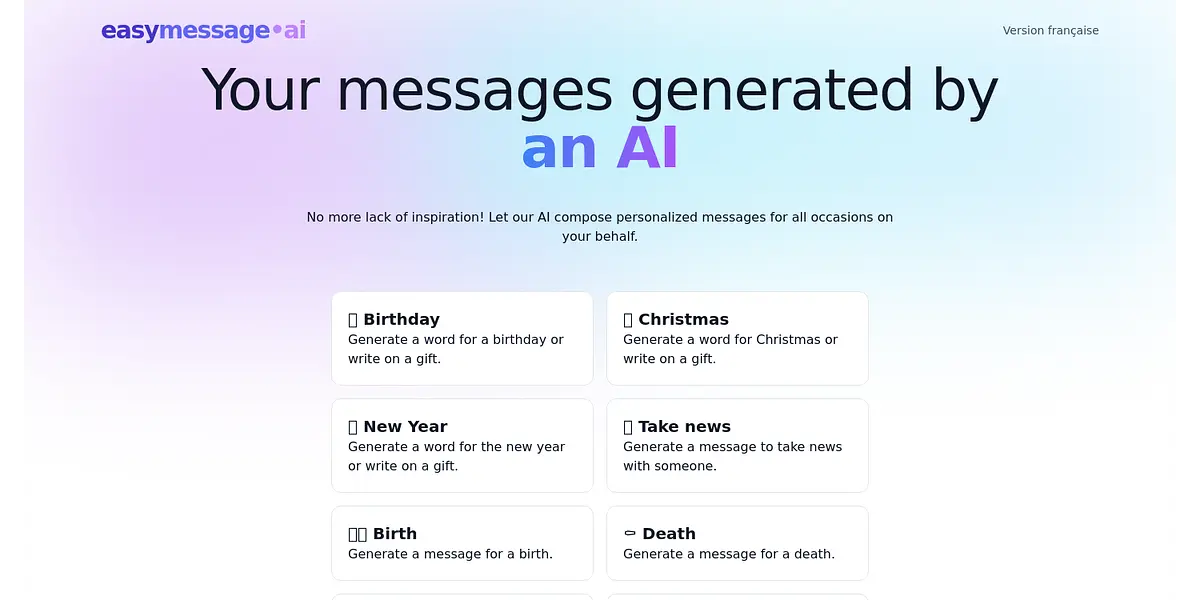 The platform offers a wide range of messages for various occasions, including birthdays, Christmas, New Year, and job offers. Users can quickly generate the message they want by selecting the appropriate category and customizing the text to fit their preferences. EasyMessage.ai also offers messages on more sensitive occasions, such as births and deaths. The platform's pre-written templates take into account the unique nuances of each occasion, ensuring that users always have the right words to say.