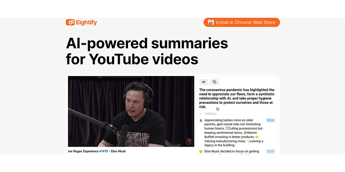 Eightify is a revolutionary AI-powered platform that generates summaries of YouTube videos, allowing you to save time and get the key points without the fluff. With Eightify, you can make decisions faster, overcome language barriers, and find solutions quicker. Get early access to Eightify now.