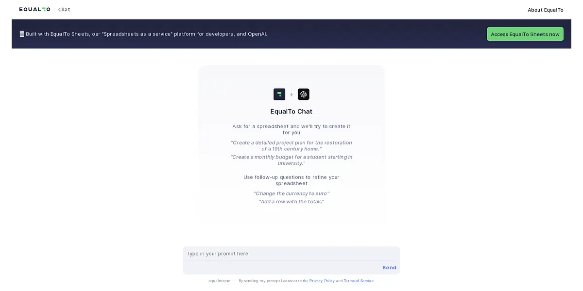 In conclusion, EqualTo Chat is an excellent tool for simplifying your spreadsheet struggles. It is an AI-based solution for people who want to reduce the time and effort needed for spreadsheet management. Give EqualTo Chat a try, and you will never go back to traditional spreadsheet management methods. Try it out now by accessing EqualTo Sheets. By sending your prompt, you also give your consent to our Privacy Policy and Terms of Service.