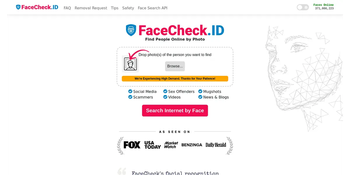 With FaceCheck.ID, you can now search and verify faces online. Drop a photo of a person you want to find and discover their social media profiles, appearances in blogs, videos, and news websites. The website helps you avoid dangerous criminals by running a scan of a person's photo against millions of faces from mugshot, sex offender websites, and suspects that appeared in the news. FaceCheck.ID also indexes violent criminals, child rapists & molesters, sex offenders, kidnappers, abusers, murderers, hate crime perpetrators, burglars, gang members, fugitives, terrorists, online dating & romance scammers, and other fraudsters to keep your family and loved ones safe.
