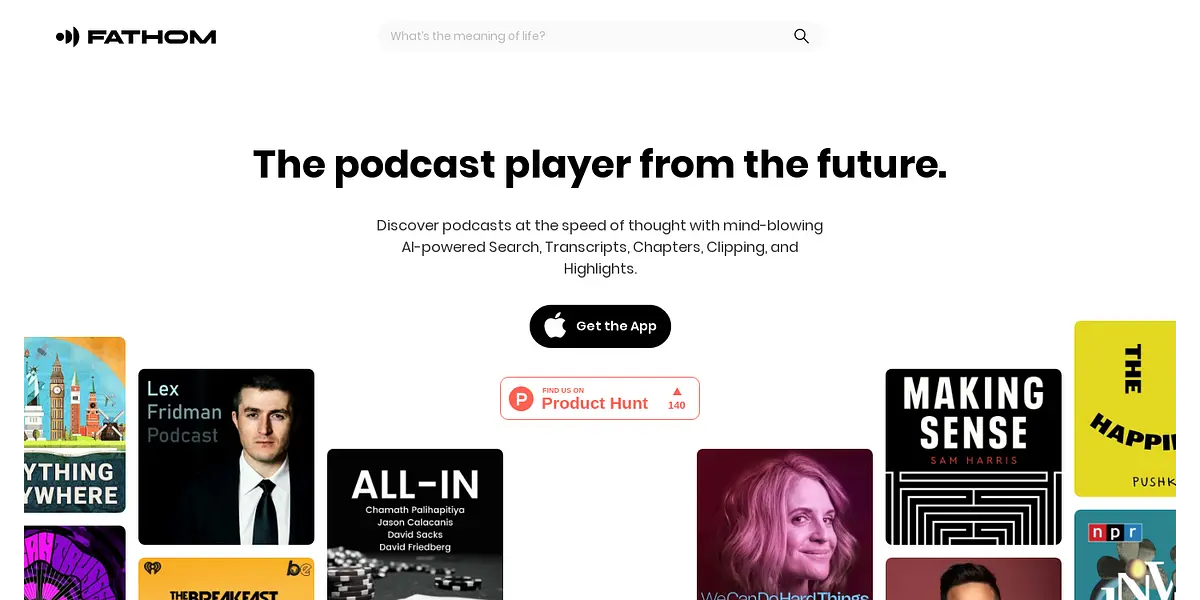Fathom is an AI-powered podcast player that lets you discover and listen to podcasts at lightning speed. With advanced search, transcripts, chapters, clipping, and highlights, Fathom makes finding and enjoying podcasts effortless.