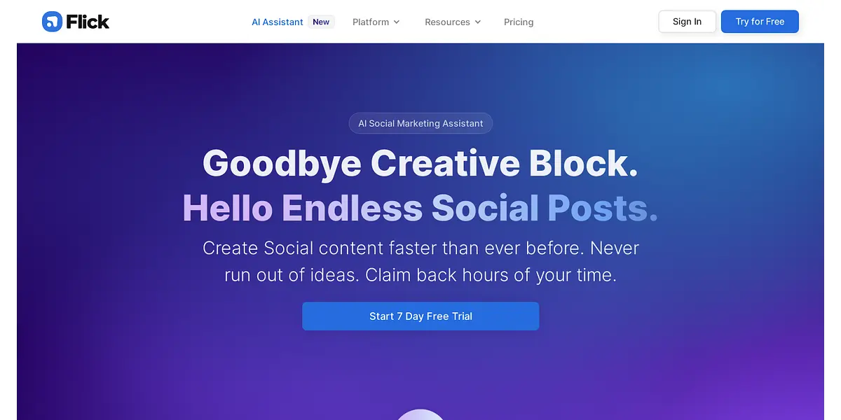 Trusted by 100k+ content creators, brands, and marketers, Flick's AI Social Marketing Assistant is a game-changer for anyone who wants to streamline their social media strategy while still delivering high-quality, engaging content. Join our 7-day free trial today and get ready to level up your social media game!