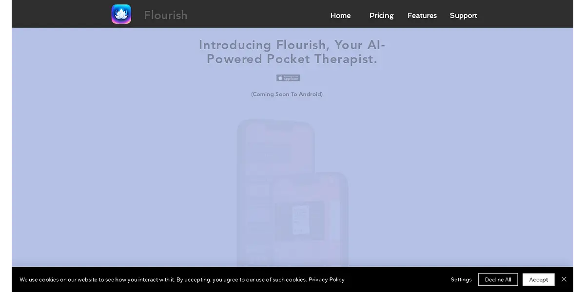 Flourish is an upcoming mobile app that provides AI-powered therapy and personalized wellness exercises for mental wellness. With Flourish, you can easily access unlimited support and evidence-based advice in a chat format, personalized wellness exercises, and mental health assessments.